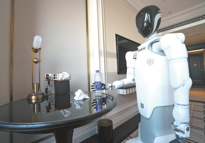 機(jī)器人在酒店客房進(jìn)行清理。