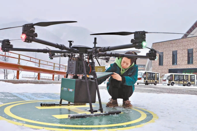 無人機(jī)搭載快遞和報(bào)刊降落在延慶冬奧村。